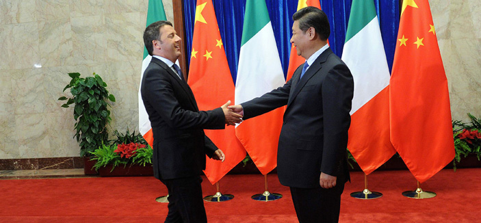 - رئيسُ الوزراء الإيطاليُ ماتيو يصافح الرئيس الصيني في قاعة الشعب الكبرى خلال الزيارة التي يقوم بها ماتيو إلى الصين ... رويترز