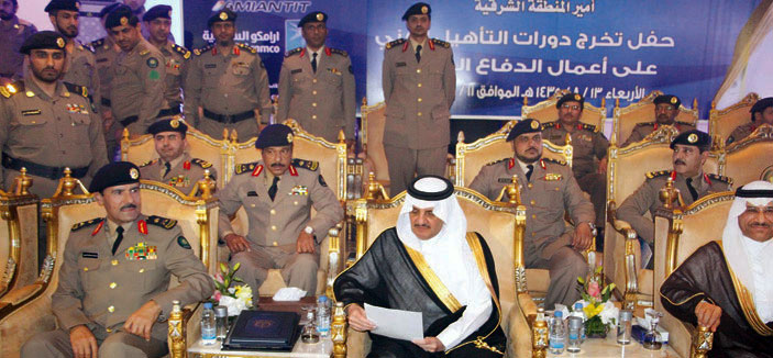 رعى صاحب السمو الملكي الأمير سعود بن نايف بن عبدالعزيز أمير المنطقة الشرقية مساء أمس الأول احتفال المديرية العامة للدفاع المدني بتخريج الدورة الثامنة والخمسين التأهيلية على أعمال الدفاع المدني والتي شارك فيها (1607) من الأفراد الذين تم تدريبهم وتأهيلهم على جميع مهارات العمل بالدفاع المدني، وكان في استقبال سموه لدى وصوله لمقر الحفل بمركز تدريب الدفاع المدني بالشرقية اللواء سليمان بن عبدالله العمرو مدير عام الدفاع المدني ومساعدوه وعدد من قيادات الدفاع المدني من جميع مناطق المملكة، وبدأت وقائع الحفل بعد عزف السلام الملكي بآيات من القرآن الكريم.