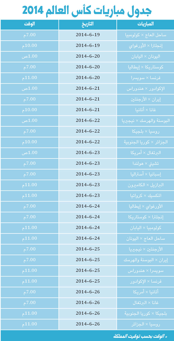 يرصد منتخبا كولومبيا وساحل العاج وضع قدم في الدور الثاني عندما يلتقيان اليوم الخميس على ملعب «ناسيونال مانيه غارينشا» في العاصمة برازيليا في الجولة الثانية من منافسات المجموعة الثالثة ضمن النسخة العشرين لكأس العالم في كرة القدم في البرازيل. وحقق كلا المنتخبين فوزاً في الجولة الأولى، حيث تغلبت ساحل العاج على اليابان 2-1، وسحقت كولومبيا اليونان بثلاثية نظيفة، وبالتالي فإن الفوز اليوم سيمنح صاحبه أفضلية كبيرة لبلوغ الدور ثمن النهائي.