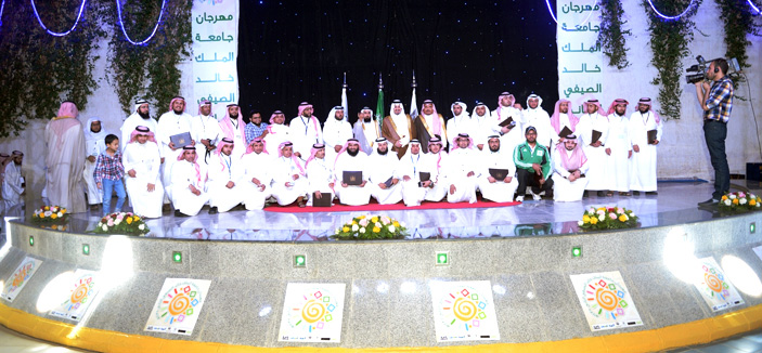 رعى صاحب السمو الملكي الأمير فيصل بن خالد بن عبدالعزيز، أمير منطقة عسير رئيس مجلس التنمية السياحية مساء أمس الأول حفل اختتام فعاليات مهرجان جامعة الملك خالد الصيفي الثاني. وكان في استقبال سموه لدى وصوله إلى مقر الحفل في ساحة الجامعة الرئيسة معالي مدير الجامعة الدكتور عبدالرحمن الداود، وعدد من أعضاء هيئة التدريس بالجامعة. وتجول سموه في المعارض المشاركة، كما استمع إلى شرح موجز من العارضين عن محتويات المعارض وأبرز ما قدمته خلال المهرجان. عقب ذلك بدئ الحفل الخطابي المعد بهذه المناسبة، حيث ألقى مدير المهرجان كلمة قال فيها: في هذه الأمسية الجميلة بحضوركم يُسدل الستار على جهد أشهر من العمل المتواصل وثمرة تعاون أنجزت أكثر من 100 فعالية متنوعة على مساحة تجاوزت 150 ألف م2 خلال خمسة أيام، واستقطبت من خلالها الكثير من أفراد المجتمع ذكوراً وإناثاً. وتابع قائلاً: تم تدريب 1200 متدرب ومتدربة ضمن دورات تدريبية تطويرية، بالإضافة إلى الأنشطة الأخرى كالمسابقات الرياضية والمسرحية وبرامج الأطفال والمرأة، حيث تم تخصيص أكثر من 57 فعالية خاصة بالمرأة.