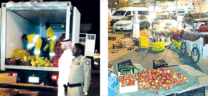وتم تطهير المواقع المخالفة داخل الحي من الباعة الجائلين غير السعوديين وبمشاركة الجهات الأمنية ومصادرة كافة البضائع الموجودة ووضعها في ثلاجة خاصة بالفرق الميدانية وتسليمها فورا للجمعيات الخيرية.