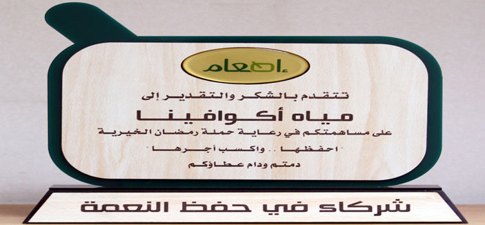 تحت رعاية مياه أكوافينا انطلقت الحملة التوعوية « احفظها - واكسب أجرها «التي تنظمها الجمعية الخيرية للطعام (إطعام ) بمناسبة حلول شهر رمضان المبارك والتي تهدف الي نشر ثقافة حفظ النعمة في المجتمع السعودي، والتغلب علي مظاهر البذخ ورمي الفائض من الطعام وإعادة توزيعه علي المستفيدين، مستهدفة في ذلك ربات البيوت وتوجيهيهن إلى عدم الاسراف وتقليل كميات الوجبات المعدة في كل وجبة وتحفيزهن علي توزيع الزائد منه على الأسر المحتاجة.
