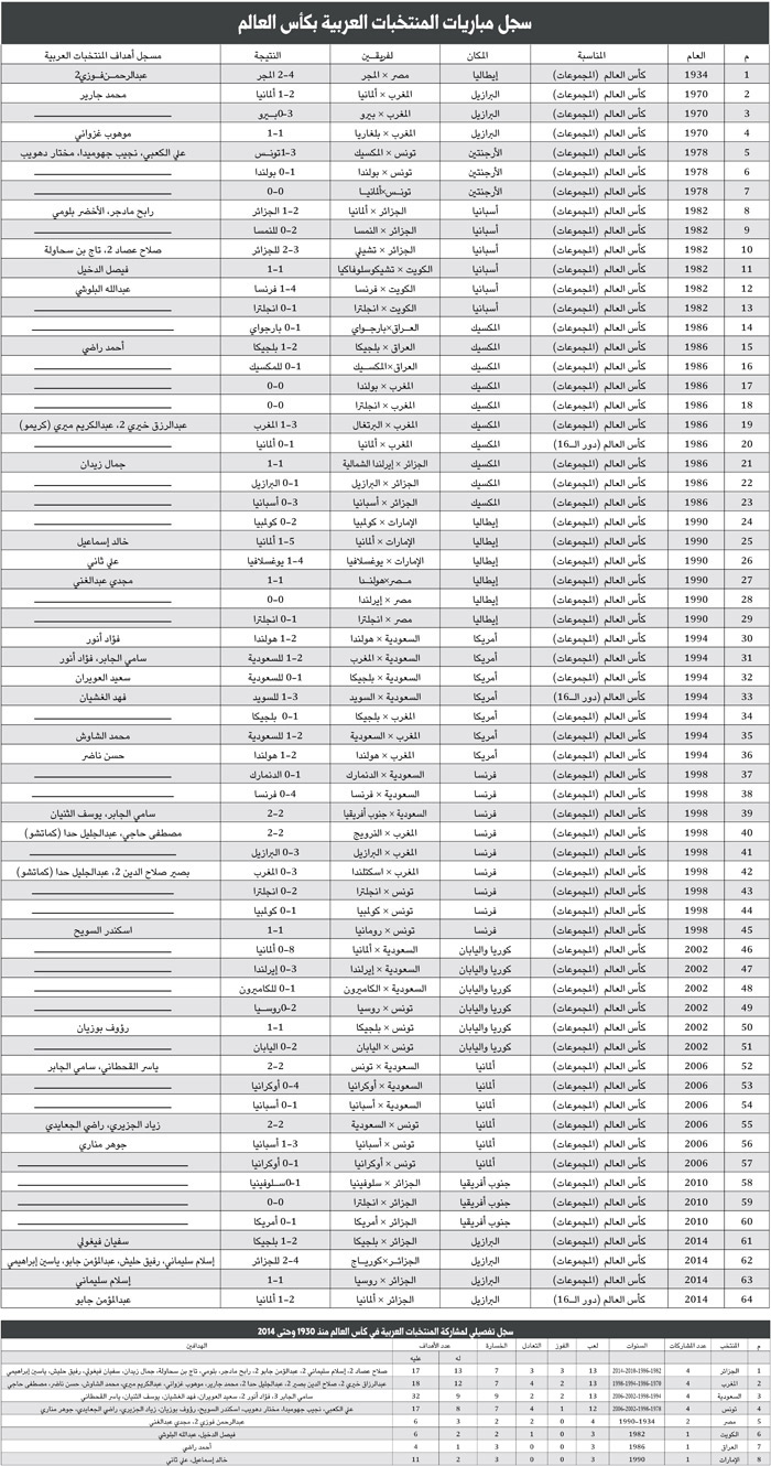 - الأرقام والإحصائيات العربية في المونديال لا تكاد تذكر مقارنة بالمنتخبات الأخرى ولكن يظل الرقم الأسطوري للأسطورة سامي الجابر بتسجيله لهدفين في مونديالين يفصل بينهما 12 سنة هو الحدث العربي الأبرز.