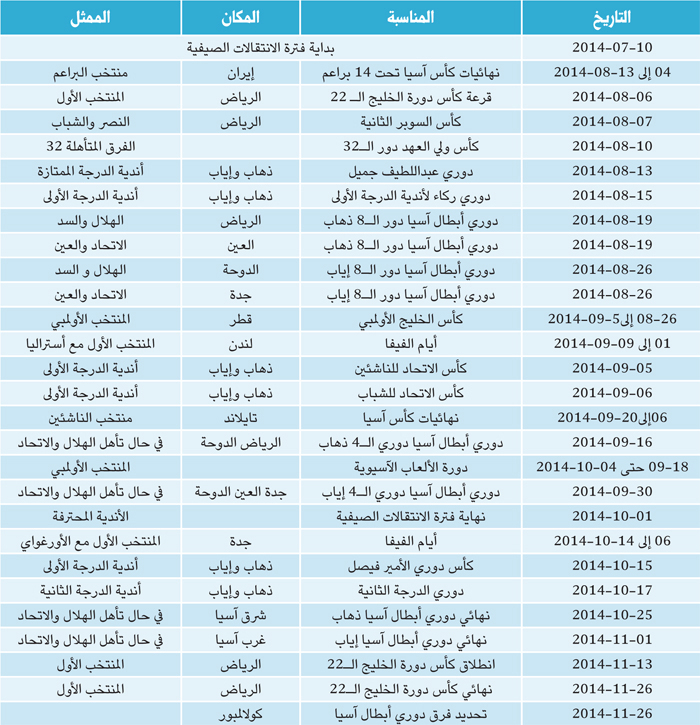يشهد الموسم الرياضي الجديد عدداً من المشاركات الآسيوية أبزرها مشاركة المنتخب الأول في كأس الأمم الآسيوية التي تُقام في أستراليا وكأس دورة الخليج التي تستضيفها المملكة ومشاركات المنتخبات السنية، إضافة إلى مشاركة الأندية السعودية في دوري أبطال آسيا والتي لم يتحدد بعد مقاعد المتأهلين والآلية الجديدة التي سيشهدها دوري أبطال آسيا 2015 وإن كانت أندية النصر والهلال والشباب هي المتأهلة والمشاركة بصفة رسمية وينتظر ما سيسفر عنه طريقة الفريق الرابع المشارك، حيث ستتضح الرؤية في شهر نوفمبر، إضافة إلى مشاركات الأندية السعودية في بطولة الأندية الخليجية.