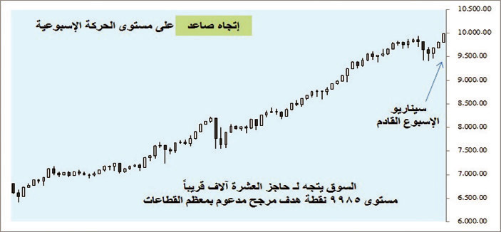 الأسبوع القادم، تكون معظم الشركات المدرجة قد أفصحت عن نتائجها المالية، وتنتهي فترة حظر تعاملات التنفيذيين بشكل تام، وعليه يرجح أن نشهد نمواً ملحوظاً للسيولة بحوالي 13% وتركيزاً أكثر على القطاع البتروكيماوي، أما المؤشر العام يرجح أن يقوم بعمل قمة صاعدة سنوية جديدة عند مستوى 9985 نقطة تتجاوز القمة السابقة 9933 نقطة، وبذلك سيكون من المتوقع تجاوز حاجز 10000 نقطة بعد انتهاء موسم النتائج المالية.