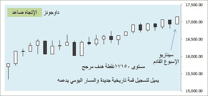 فرط مؤشر الداوجونز بقمته التاريخية التي سجلها الأسبوع الماضي عند مستوى 17074 نقطة، وتعرض لجني أرباح، ومع نهاية الأسبوع بدأ مساراً صاعداً يومياً، لكنه أنهى التعاملات على نمط بيعي متوسط القوة.