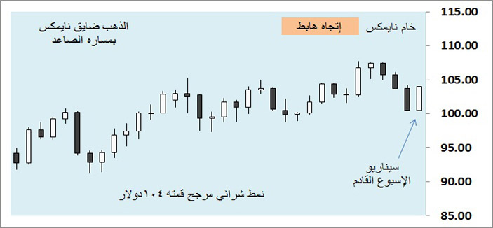 شهية المخاطرة تراجعت هذا الأسبوع، وتجسدت في ارتفاع المعدن النفيس إلى مستوى 1340 دولاراً للأونصة، ضمن مسار صاعد؛ وعليه انتهى أسبوع نايمكس بنمط بيعي قوي إلى مستوى 100.5 دولار، تزامن مع تراجع مخزونات النفط الأمريكية. ويرجح الأسبوع المقبل أن ينتهي الأسبوع بنمط شرائي، يشطب خسائر هذا الأسبوع، ويغلق عند مستوى 104 دولارات مدعوماً بتوقعات أن ترفع أوبك من إنتاجها اليومي لرقم قياسي جديد.