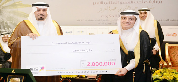 تسلّم صاحب السمو الملكي الأمير مشعل بن عبدالله بن عبدالعزيز أمير منطقة مكة المكرمة، من مدير عام الشؤون الإعلامية بشركة الاتصالات السعودية أمجد شاكر، شيكاً بمبلغ مليوني ريال، لقاء رعاية الشركة لجائزة مكة للتميز، والتي تُمنح سنوياً لتكريم المبدعين والمتميزين في جميع المجالات الفكرية والعلمية والعملية.