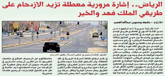 وكانت «الجزيرة» قد نشرت أمس الأول مطالبات سكان الحيين في إيجاد حل للإشارة المرورية المعطلة التي أدت إلى الازدحام على طريقي الملك فهد والخير.