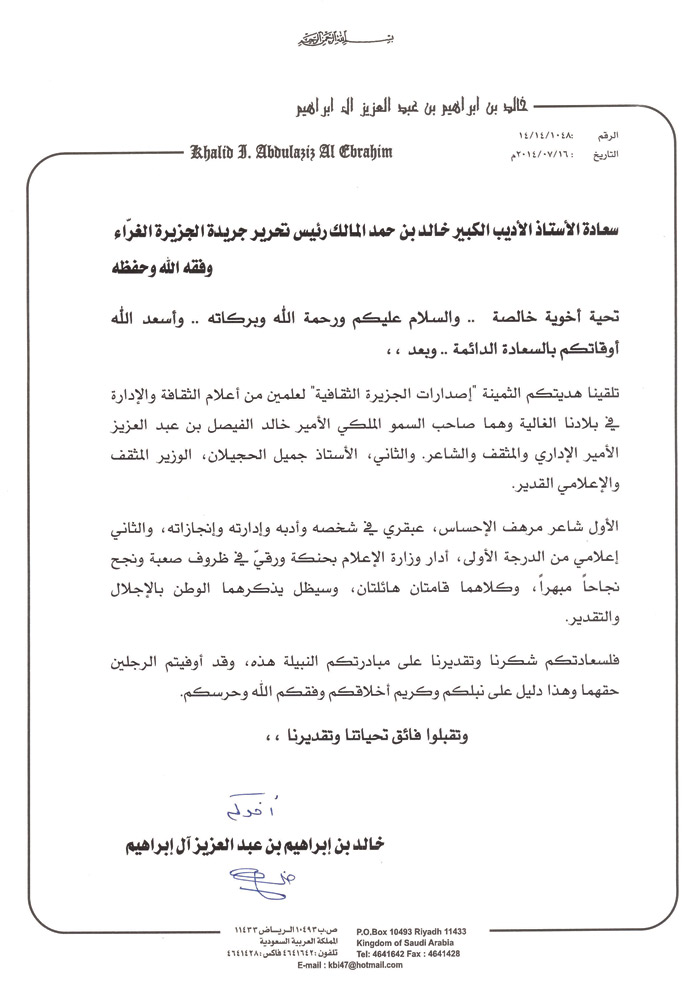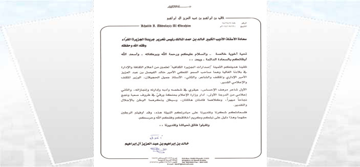 تلقى سعادة رئيس التحرير رسالة شكر من الشيخ خالد بن إبراهيم بن عبد العزيز آل إبراهيم وذلك إثر تلقّيه كتابين من إصدارات الجزيرة الثقافية هما كتاب: (خالد الفيصل الأمير .. المسؤول .. المثقف)، وكتاب: (جميل الحجيلان بين الإعلام والدبلوماسية)، وقال آل إبراهيم في رسالته: الأول شاعر مرهف الإحساس عبقري في شخصه وأدبه وإداراته وإنجازاته، والثاني إعلامي من الدرجة الأولى أدار وزارة الإعلام بحنكة ورقي في ظروف صعبة ونجح نجاحاً مبهراً وكلاهما قامتان هائلتان وسيظل يذكرهما الوطن بالإجلال والتقدير.