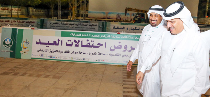 وفي مستهل جولته التفقدية دشّن أمين منطقة الرياض الموقع الإلكتروني لاحتفالات عيد الفطر بمقر المركز الإعلامي للاحتفالات بمتنزه الملك عبد الله بالملز، وأطلع على الخدمات التي يقدمها الموقع الذي يمكن الدخول عليه من خلال الرابط (eid1435.alriyadh.gov.sa) لمعرفة مواقع إقامة الفعاليات وطرق الوصول إليها ودليل الفعاليات في كلِّ موقع بالإضافة إلى أخبار ومقاطع فيديو وألبوم صور العيد، حيث سيتم السحب على 10 جوائز مخصصة للمسجلين بالموقع، كما تفقد معاليه متنزه الملك عبد الله الذي سيشهد الحفل الرسمي للأمانة ووقف على استعدادات المركز الإعلامي للاحتفالات واطلع على الخطة الإعلاميَّة لمتابعة فعاليات العيد، كما تفقد مسرح الفعاليات الذي تَمَّ تجهيزه بالمتنزه بمساحة تقريبية 450م2 ليقدم باقة من الفنون الشعبية الفلكلورية المختلفة طوال أيام العيد، ثمَّ انتقل الأمين إلى مركز الملك عبد العزيز التاريخي الذي سيشهد إقامة عدد من الفعاليات العائلية مثل الخيمة الشعبية التي تقدم العديد من الفقرات الشعبية والتراثية والأدبيَّة بمشاركة نخبة من الشعراء المعروفين والفرق الشعبية التي ستقدم أنواع من الفلكلور الشعبي لمنطقة الرياض ومناطق أخرى في المملكة. وواصل المهندس المقبل جولته التفقدية بزيارة ساحة الدوح واطلع على برنامجها الذي يتَضمَّن فقرات منوعة ومخصصة للعائلات، ثمَّ انتقل إلى الصالة الرياضيَّة المغلقة بمجمع الأمير فيصل بن فهد الأولمبي بحي الرفيعة غرب الرياض الذي سيقدم عروض «ستاند أب كوميدي» بمشاركة عدد من نجوم الكوميديا الارتجالية وفقرات وألعاب الخفة طوال أيام العيد، كما وقف معاليه على تجهيزات الفعاليات النسائية ومسرحيات الأطفال في مركز الملك فهد الثقافي والإجراءات الخاصَّة بالإشراف على الفعاليات النسائية من أجل راحة الزائرات والمشاركات في فعاليات المركز الذي سيستضيف العديد من الأنشطة النسائية الممتعة ضمن احتفالات العيد.