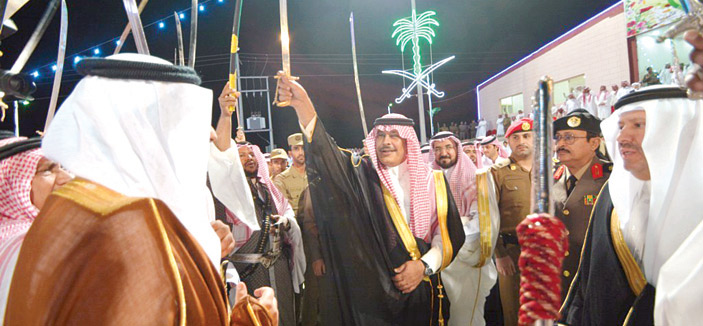 بعدها ألقيت قصيدة شعرية نالت استحسان الحضور , ثم قدمت لوحة فلكلورية شعبية جسدت فرحة الأهالي بالعيد, تلاها العرضة السعودية التي شارك سمو أمير المنطقة الأهالي في تأديتها.