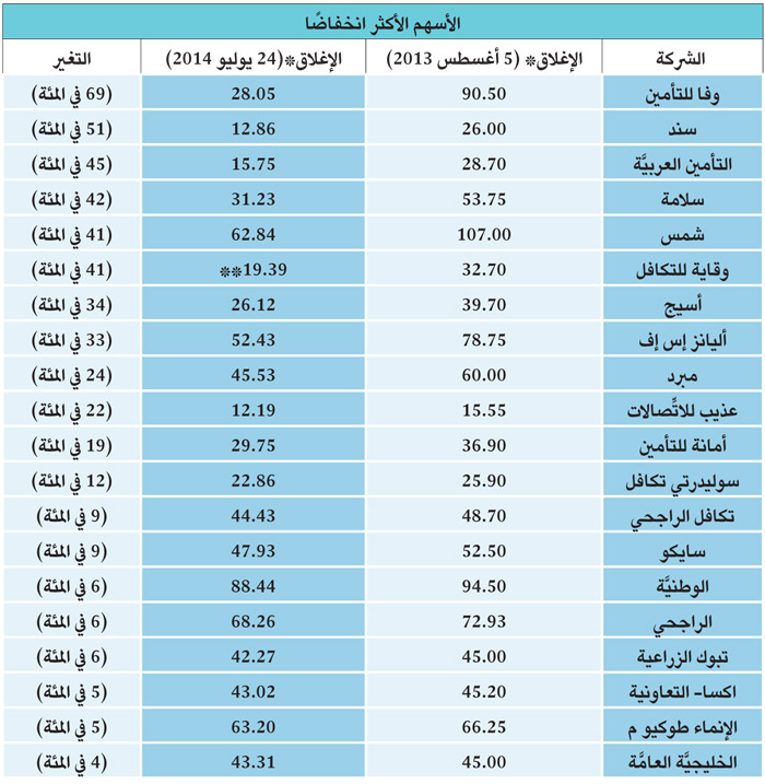 فيما كانت أغلبية الشركات المنخفضة من شركات التأمين، تقدمها سهم «وفا» بنسبة 69 في المئة، وضمَّت القائمة سهم «مصرف الراجحي» المتراجع خلال الفترة بنحو 6 في المئة، وفيما يلي أداء الأسهم الأكثر انخفاضًا بين إجازتي عيد الفطر لعامي 2013 - 2014، كما يوضح الجدول أدناه: