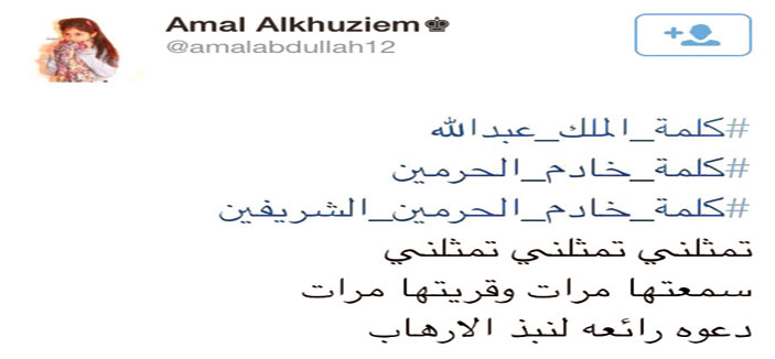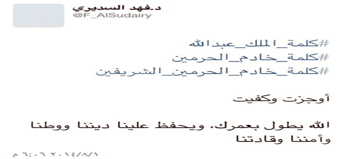 وأطلق المغردون عدداً من الهاشتاقات والتي صاحبت كلمة خادم الحرمين وتفاعلوا معها مؤيدين ما جاء في كلمته - حفظه الله - ولعل الوسم #كلمة - الملك - عبدالله هي الأكثر تفاعلاً، حيث وصلت التغريدات فيها إلى أكثر من تسعين ألف تغريدة خلال أربع ساعات ، فيما كانت هناك هاشتاقات عديدة ، منها كلمة خادم الحرمين ، كلمة أمير المؤمنين ، وكلمة الملك عبدالله تمثلني وغيرها من الهاشتاقات النشطة ، «الجزيرة» جالت بين تلك التغريدات وخرجت بالتالي: