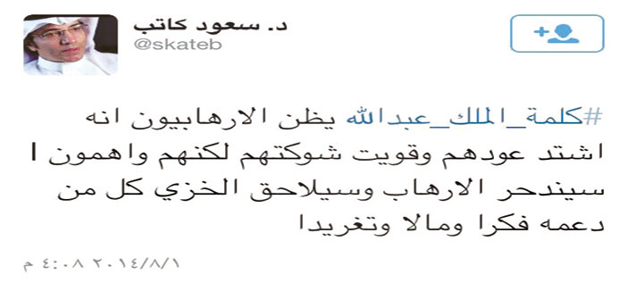 @skateb: #كلمة - الملك - عبدالله يظن الارهابيون انه اشتد عودهم وقويت شوكتهم لكنهم واهمون I سيندحر الارهاب وسيلاحق الخزي كل من دعمه فكرا ومالا وتغريدا