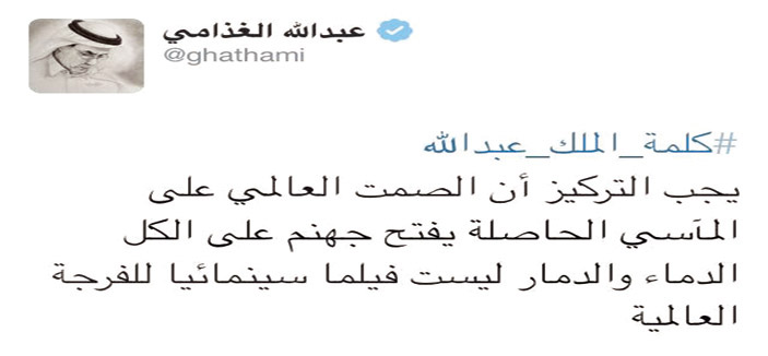 @mAlowein: كلمة الملك عبدالله تشكو ضعف الأمة العربية وتفككها وكأنها جزر متباعدة ، وتلوم العالم الذي يتفرج على الإرهاب فقط دون أن يتقدم خطوة لمحاربته !