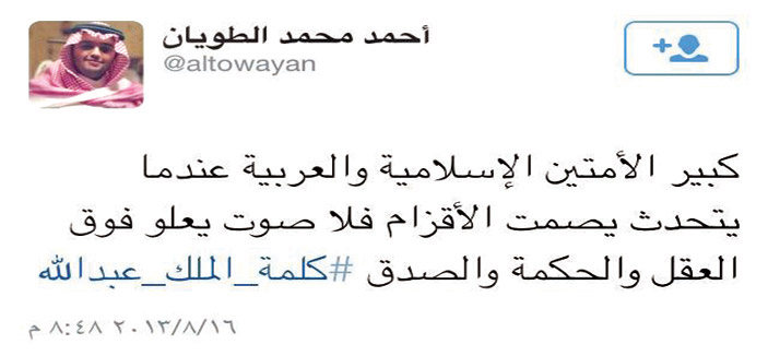 @altowayan: كبير الأمتين الإسلامية والعربية عندما يتحدث يصمت الأقزام فلا صوت يعلو فوق العقل والحكمة والصدق #كلمة - الملك - عبدالله