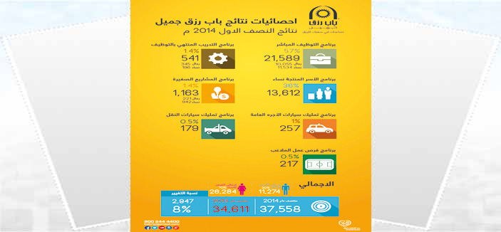 حقق «باب رزق جميل السعوديَّة» - إحدى مبادرات عبداللطيف جميل الاجتماعيَّة - قفزة مميزة في توفير فرص العمل خلال النصف الأول من العام الجاري 2014 حيث ساهم في توفير ما يزيد على 37.558 فرصة عمل للشباب والشابات السعوديين خلال الأشهر الستة الأولى من العام 2014م. بزيادة تجاوزت 2736 فرصة عمل وبنسبة مئوية بلغت 8 في المئة عمَّا تحقق في نفس الفترة من العام الماضي 2013م.