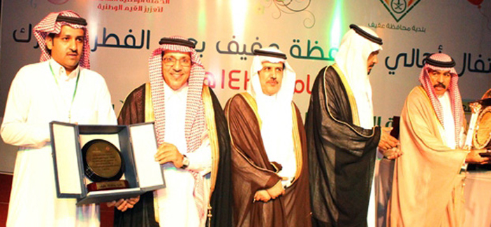 احتفل أهالي محافظة عفيف بعيد الفطر المبارك تحت شعار: «الحملة الوطنية الشاملة لتعزيز القيمة الوطنية- وطننا أمانة»، وذلك برعاية محافظ عفيف الأستاذ رشيد الجبرين، بحضور رؤساء الأجهزة الحكومية والأعيان، بحديقة الملك عبدالعزيز على مدار يومين. وشمل الحفل على فقرات متنوعة، بدأت بكلمة رئيس بلدية عفيف الأستاذ محمد الغريب، بعدها كلمة المحافظ، ثم قصيدة وطنية للشاعر خالد العطاوي، بعدها تفاعل الجميع مع الفقرات المتنوعة بين السامري والشيلات والعرضة السعودية، التي شارك فيها محافظ عفيف ورئيس البلدية وعدد من أعيان المحافظة، وبعدها أضاءت الألعاب النارية سماء المحافظة ثم جرى تكريم الرعاة والداعمين.
