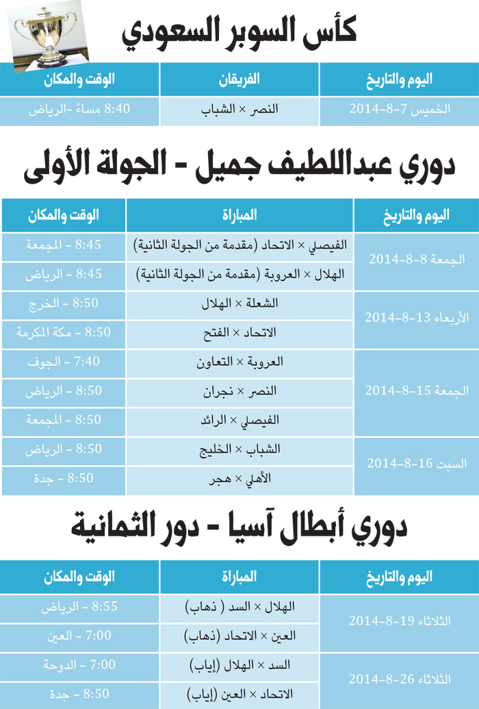 يرعى صاحب السمو الملكي الأمير تركي بن عبدالله بن عبدالعزيز أمير منطقة الرياض مساء اليوم الخميس مباراة كأس السوبر التي ستقام على درة الملاعب إستاد الملك فهد الدولي بالرياض.