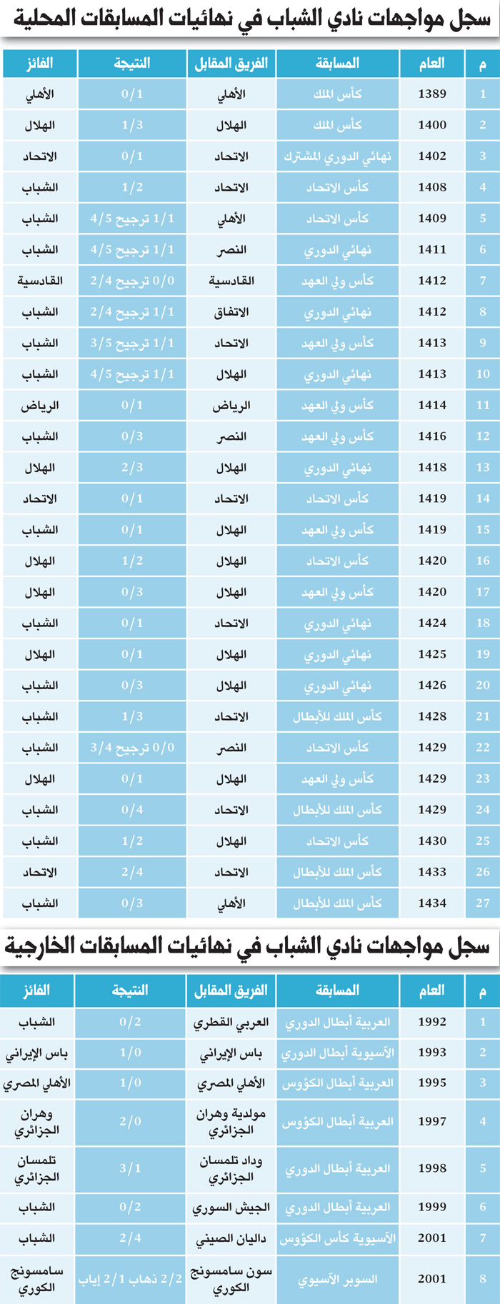وفيما يلي سجل المواجهات النصراوية والشبابية في النهائيات المحلية: