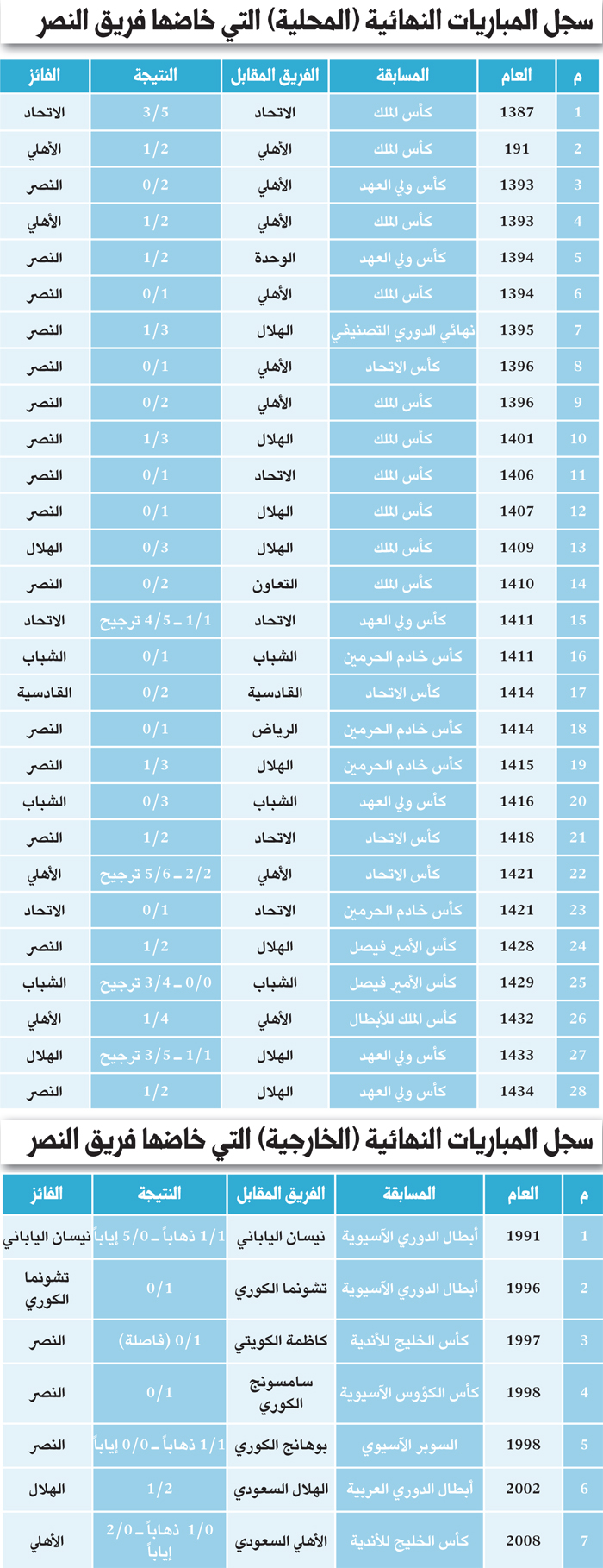 ينتظر الفريق النصراوي مساء اليوم الخميس تجيير اللقب المحلي رقم 19 في تاريخه عندما يلعب النهائي المحلي رقم 29 بينما سيكون الفريق الشبابي أمام النهائي رقم 28 للبحث عن الفوز باللقب المحلي رقم 17.