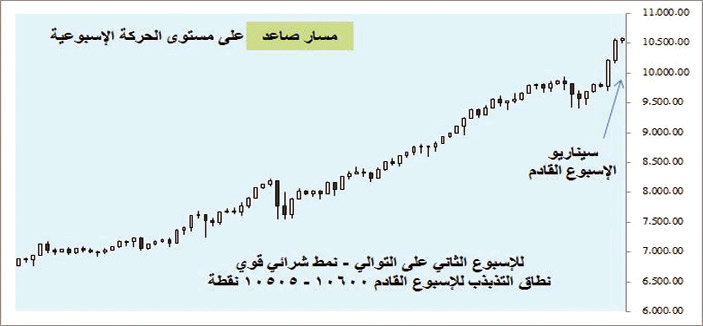 يرجح الأسبوع القادم أن يستمر السوق بالصعود لمستوى 10600 نقطة ثم يدخل مرحلة استراحة لكن مواصلة الصعود واردة جداً ليس لتحسن المؤشرات الفنية، بل لتأخر القطاعين المصرفي والبتروكيماوي عن السوق حيث بلغت مكرراتهم على التوالي (15.5- 16 - 18.3 مرة) وواضح جداً حجم الاهتمام من قبل المستثمرين بسبب إغراء الأساسيات. حيث إن هذه المكررات تعطي تصور أن الأسعار ما زالت رخيصة مقارنة بصعود السوق.