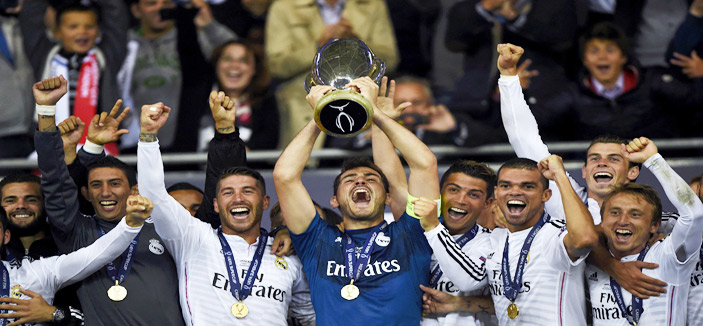 توج فريق ريال مدريد الإسباني بلقب كأس السوبر الأوروبي لكرة القدم للمرة الثانية في تاريخه بعد فوزه على مواطنه اشبيلية بهدفين نظيفين في المباراة التي جمعت بينهما مساء أمس الثلاثاء في مدينة كارديف الويلزية . ويدين النادي الملكي بالفضل في هذا الفوز لقائد المنتخب البرتغالي كريستيانو رونالدو الذي سجل هدفا في كل شوط، في الدقيقتين 30 و48.