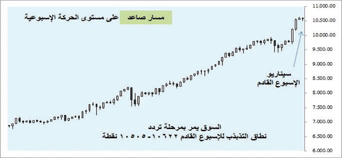 - منطقة حيرة ونمط متوازن مرجح قاعه 10505 نقاط، وقمته عند 10622 نقطة للسوق.
