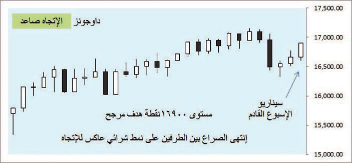 انتهى المسار الهابط في داوجونز عند القاع 16518 نقطة بعد صراع قوي بين المشترين والبائعين كانت الغلبة فيه للمشترين عبر نمط شرائي عاكس للإتجاه الهابط أعاد مؤشر الداوجونز للمنطقة الخضراء والمسار الصاعد على مستوى الحركة الإسبوعية بسبب هدوء نسبي في قضية أوكرانيا وتحسن لبعض المؤشرات الاقتصادية، ويتوقع الاسبوع المقبل أن يعمل داوجونز قمة وذروة سعرية عند مستوى قريب من 17000 نقطة.