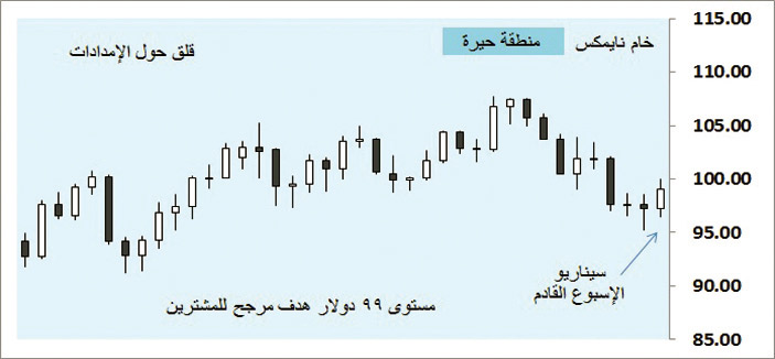 أكمل خام نايمكس هبوطه بعنف نهاية الاسبوع المنصرم ولم يتوقف البائعون عن بيعهم إلا بعد الارتطام بالحاجز النفسي والفني 95 دولارا منهياً الاسبوع عند مستوى 97.25 دولار وبنمط متوازن مليء بالحيرة والتردد، بعد سيطرة داعش على 17 % من نفط العراق وبيع البرميل بحوالي 20 %، ويرجح الاسبوع أن يبدأ نايمكس بعملية ارتداد تدريجية إلى مستوى قريب من الحاجز المئوي 100 دولار والإغلاق عند مستوى 99 دولارا.