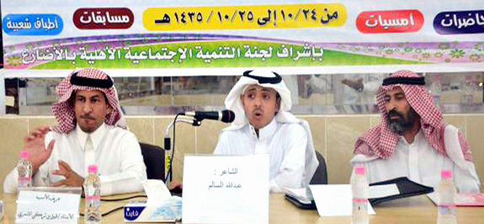 اختتم مهرجان الأضارع السادس لعام 1435هـ فعالياته بصالة الاحتفالات بمركز الأضارع. واشتمل اليوم الأخير من المهرجان على مسابقات ترفيهية، شارك فيها الكبار والصغار، ثم محاضرة دينية للشيخ ناصر العديلي، تحدث فيها عن طاعة ولاة الأمر، وأسباب استجابة الدعاء. ثم أُقيمت أمسية شعرية للشاعر طعيسان الشمري والشاعر عبدالله السالم، أدارها الأستاذ قبيل الشمري. وقدم الشاعران قصائد نالت استحسان الحضور. ثم أُقيمت مسابقة للأسر المنتجة، اشتملت على عدد من الأطباق الشعبية. وفي نهاية الحفل وُزعت الجوائز للفائزين بالمسابقات المختلفة، وقدم رئيس اللجنة الأستاذ فهد الشمري شكره وتقديره للحضور على تفاعلهم مع برامج لجنة التنمية، وكذلك شكره لجميع العاملين في اللجنة المنظمة التي ساعدت على إنجاح هذا المهرجان.