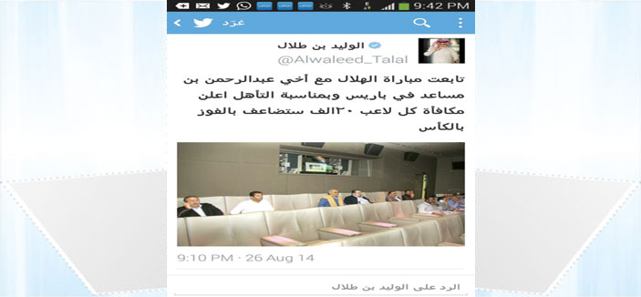 وكان الأمير الوليد بن طلال قد أعلن عن تقديمه مكافأة للاعبي الفرق الهلالي من خلال تغريدة على حسابه الخاص بتويتر قال فيها: « تابعت مباراة الهلال مع أخي عبد الرحمن بن مساعد في باريس وبمناسبة التأهل أعلن مكافأة كل لاعب 20 ألف ريال، ستتضاعف بالفوز بالكأس».