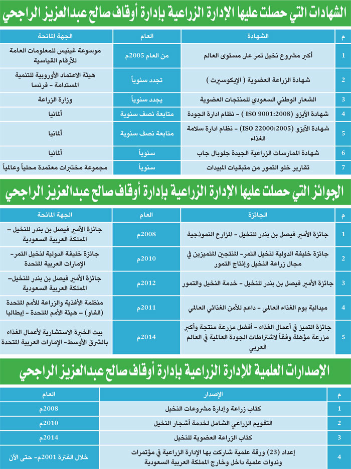 إنّ هذه الشهادة العالمية تأتي ضمن سلسلة من الشهادات والجوائز الكبرى التي حققتها الإدارة الزراعية في إدارة الأوقاف، حيث سُجل مشروع الباطن الزراعي في مدينة بريدة بمنطقة القصيم كأكبر مشروع نخيل تمر على مستوى العالم حسب موسوعة غينيس للمعلومات العامة والأرقام القياسية في مايو 2005م، كما حصلت الإدارة على جوائز محلية وإقليمية ودولية مهمة في مجالها الزراعي، مثل: جائزة الأمير فيصل بن بندر للنخيل على مستوى المزارع النموذجية بمنطقة القصيم في دورتها الثانية عام 2008م، وفي فئة خدمة النخيل والتمور بدورتها الثالثة لعام 2012م، وجائزة خليفة الدولية لنخيل التمر لفئة المنتجين المتميزين في مجال زراعة النخيل وإنتاج التمور في دورتها الثانية عام 2010م، وميدالية يوم الغذاء العالمي كداعم للأمن الغذائي العالمي لعام 2011م من منظمة الأغذية والزراعة للأمم المتحدة (الفاو)، وجائزة التميز في أعمال الغذاء لعام 2014م، كما تحصل الإدارة سنوياً على الشهادات الصحية من مختبرات جامعة الملك سعود وجامعة القصيم ومختبر السموم بمستشفى الملك فيصل التخصصي ومختبر (إيداك) التي تفيد بخلو منتجات مشروعات الإدارة الزراعية من متبقيات المبيدات، وحصلت الإدارة كذلك على شهادة الزراعة العضوية من هيئة الاعتماد للتنمية المستدامة (الإيكوسيرت) بفرنسا عام 2007 م والتي تجدد سنوياً وفق سلسلة من الإجراءات، وشهادة الآيزو (ISO 9001) والخاصة بنظام إدارة الجودة، وشهادة الآيزو (ISO 22000) لتطبيق الإدارة معايير ومواصفات نظام إدارة السلامة الغذائية.