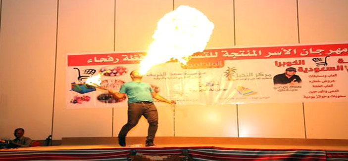 لازال مهرجان «الأسر المنتجة للتسوق بمحافظة رفحاء يواصل» عروضه وفعالياته اليومية على المسرح الرئيسي وسط إقبال كثيف من الجمهور من داخل المحافظة وخارجها حيث قدمت فرقة الكوبرا السعودية الاستعراضية عددا من الفقرات المميزة مثل اللعب بالنار والمسابقات وعروض أخرى مثيرة ميزت فعاليات يوم الافتتاح, الذي بدأ من بعد صلاة العشاء واستمر الى منتصف الليل ، قدمها الإعلامي المميز مشاري المانع وبمشاركه قائد الفرقة الإعلامي والكابتن حميد الدخيل و مشعل المانع ومنصور المانع واحمد المانع وعبدالمحسن المانع.