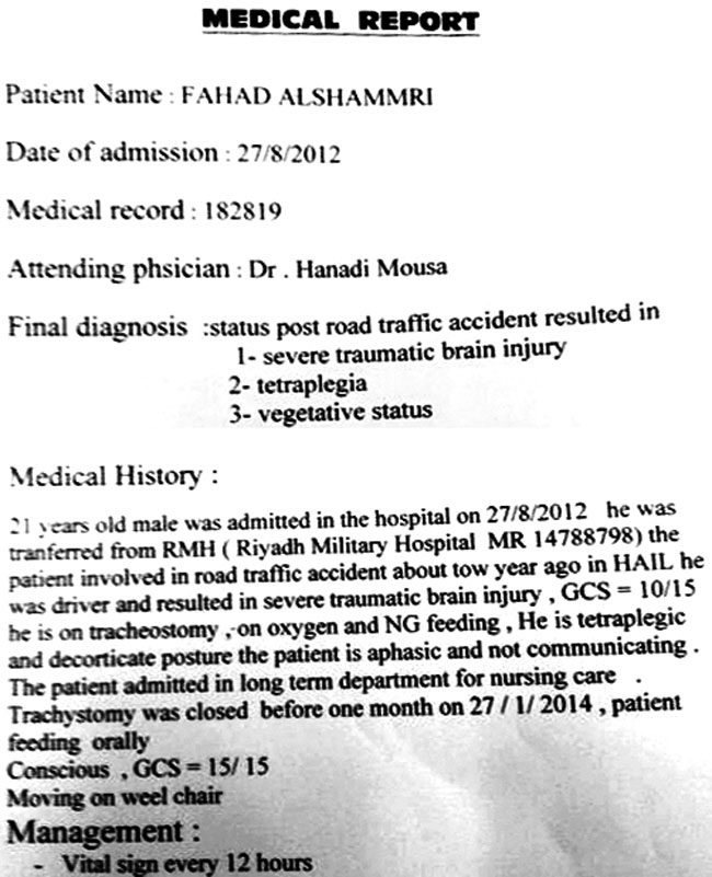 الشاب فهد الشمري البالغ من العمر عشرين عاماً، شاءت قدرة المولى أن يصاب في حادث سير قبل عامين على طريق حائل - بقعاء، حيث أصيب بضربة قوية في الرأس أدخلته في غيبوبة وظل في العناية المركزة فترة طويلة على الأجهزة، ومع مرور الأيام وتلقي العلاج تحسنت حالته قليلاً، ولكنه ما زال طريح الفراش ولا يستطيع تحريك أطرافه لا سيما الجزء السفلي، ويسعى ذووه لعلاجه في أحد المستشفيات المتقدمة ويناشدون أهل الخير التدخل ونقله إلى أحد المراكز المتخصصة سواء بالداخل أو الخارج وإعادة الأمل له ولأسرته المكلومة.