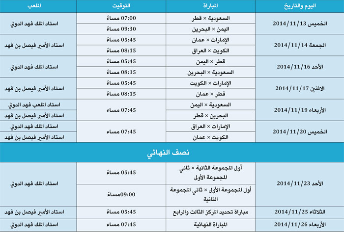 على أن تقام بقية مباريات الدورة كما هي موضحة بالجدول حيث ستقام المباراة النهائية في الـ26 من الشهر ذاته على استاد الملك فهد الدولي في السابعة و45 دقيقة مساءً.