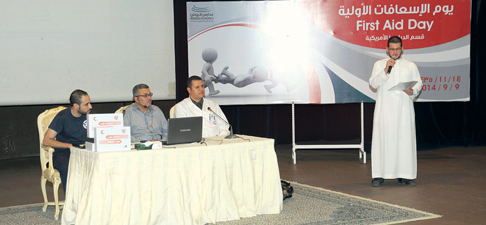 تفعيلاً لدورها الاجتماعي والتوعوي، نظمت مدارس الرياض فعاليات اليوم العالمي للإسعافات الأولية أمس بالتعاون مع هيئة الهلال الأحمر السعودي (اليوم العالمي للإسعافات الأولية يصادف يوم 9/9/2014)، حيث تخلل الفعاليات محاضرة بعنوان «مبادئ الإسعافات الأولية»، وذلك في المسرح الصغير بالمدارس، بحضور الدكتور جمال الحاج أخصائي طب طوارئ وجراحة عظام بهيئة الهلال الأحمر السعودي. واشتملت الفعاليات على توزيع جوائز مقدمة لثلاثة فائزين من الطلاب باختيار أفضل «مقال» كتب باللغة الإنجليزية عن دور الإسعافات الأولية في المجتمع، وفاز بالجوائز الطلاب: عبد الله الخاني ويوسف الجهني وعلي الزهراني.