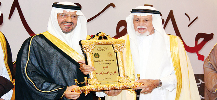 ثم ألقى الفائز بالجائزة علي الجميعة كلمة أوضح فيها أن الجائزة هي تكليف له لبذل المزيد من العمل، مقدمًا شكره لصاحب السمو الملكي الأمير سعود بن عبد المحسن أمير منطقة حائل على رعايته لهذا الحفل، كما شكر سمو نائب أمير المنطقة على تشريفه لهذا الحفل. مستعيدًا ذكرياته منذ سنواته الأولى التي تزامنت مع توحيد المملكة على يد المغفور له الملك عبد العزيز -رحمه الله- مشيدًا بما قام به موحد البلاد من جهود تأسيسية كما نوّه بما قام به أبناؤه البررة ملوك البلاد حتَّى عهد خادم الحرمين الشريفين الملك عبد الله بن عبد العزيز - حفظه الله- وقال: هذه المسيرة لهذه البلاد وسنواتها المقاربة لعمره تجعل من جسده وهيئته تمثلان مع ثقافته وخبرته ملامح مرحلة مهمة من بلادنا سائلاً الله أن يجعله دومًا في خدمة الوطن والقيادة وأهالي المنطقة وغيرها من مناطق المملكة الذين غمروه بمشاعرهم الصادقة.
