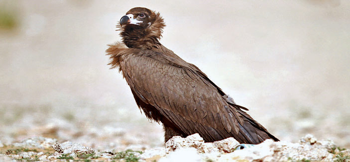 خامساً/ النسر الأسود (نسر سيريونيس) الاسم الإنجليزي Cinereous Vulture والاسم العلمي Aegypius monachus : وهو من النسور المهاجرة وتصل في نهاية شهر نوفمبر وديسمبر وتبقى بالمملكة خلال شهور الشتاء، وهذا النوع مشابه لنسر الأذون فهو يعشش أيضاً على الأشجار، ولكنه أكبر حجماً ومختلف عنه شكلياً بلونه الأسود وكبر جناحيه والرأس خالٍ من الريش والرقبة تميل للون الأزرق الرمادي والرأس مغطى بزغب أسود يزيد في الصغار وكأنه برقع، ويعشش في مناطق الغابات والمناطق الجبلية، وسجل بالمنطقة كطائر مهاجر عابر وكذلك كزائر شتوي حيث سجل خلال فترة الشتاء بالقرب من جبل العامود والذي كان يعتقد سابقاً أنه من الطيور المعششة بالمنطقة، وقد أشارت إحدى الدراسات إلى أن أحد فروخ هذه الطيور تم وضع أجهزة متابعة بالأقمار الاصطناعية في منطقة بجورجيا بالقرب من الحدود مع أذربيجان أنها عبرت المملكة من منطقة الحدود الشمالية لتصل لمناطقها الشتوية بالمملكة، وذلك في المنطقة بين الرياض والمدينة، ويبدأ موسم التكاثر بين شهري فبراير وإبريل وتضع الأنثى في معظم الأحيان بيضة واحدة ونادراً ما تضع بيضتين وذلك في أعشاش على الأشجار يصل قطرها بين 1.5-2م وسمك يصل إلى ثلاثة أمتار وذلك لأنها تبني الأعشاش الجديدة فوق القديمة، وتصل فترة حضانة البيض بين 54-56 يوماً ويخرج الفرخ وعليه زغب رمادي، ويصل لسن الطيران وعمره بين 95-120 يوما، وتعرف هذه الطيور بأنها من الطيور المعمرة حيث تصل أعمارها إلى أكثر من 39 سنة. وهذا النوع صنف من الأنواع القريبة من مرحلة الانقراض حيث تناقص بشكل كبير في معظم مناطق انتشاره.
