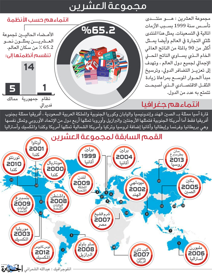 ينتظر أن تعقد قمة قادة مجموعة العشرين 2014 في بريسبان من 15- 16 نوفمبر في مركز مؤتمرات ومعارض بريسبان في أستراليا، حيث يركز جدول أعمال استراليا لمجموعة العشرين في 2014 على تعزيز النمو الاقتصادي من خلال تحسين نتائج التجارة والتوظيف وجعل الاقتصاد العالمي أكثر مرونة للتعامل مع الصدمات في المستقبل، وستقدم قمة بريسبان للقادة بيانا يتضمن التزامات السياسات لمجموعة العشرين وكيفية تنفيذها. وفي إطار التحضير لقمة قادة مجموعة العشرين، تستضيف أستراليا مجموعة من التجمعات بما في ذلك اجتماعات وزراء المالية ووزراء التجارة ووزراء العمل ونواب المالية ومجموعات العمل حول مواضيع محددة. وبالنظر إلى التحديات الاقتصادية على الصعيد العالم والأزمات المالية التي أفرزتها، فإن مجموعة العشرين تعتمد على تحليل السياسات وعلى المشورة من المنظمات الدولية بما في ذلك مجلس الاستقرار المالي، منظمة العمل الدولية، صندوق النقد الدولي، منظمة التعاون الاقتصادي والتنمية، الامم المتحدة، البنك الدولي ومنظمة التجارة العالمية، حيث يتم دعوة ممثلي هذه المنظمات الى اجتماعات مجموعة العشرين الرئيسية. وتجمع مجموعة العشرين التي بدأت في 1999 كاجتماع لوزراء المالية ومحافظي البنوك المركزية في اعقاب الازمة المالية الآسيوية، قادة كبرى الاقتصادات المتقدمة والناشئة في العالم معا لمواجهة التحديات الاقتصادية العالمية، حيث يجتمع قادة اقتصادات مجموعة العشرين سنويا، في حين يجتمع وزراء مالية مجموعة العشرين ومحافظو البنوك المركزية عدة مرات خلال العام.كما ظهر من استجابة مجموعة العشرين للأزمة المالية العالمية في 2008، فإنها من الممكن أن تتخذ الإجراءات الحاسمة من شأنها تحسين حياة الشعوب. وقد تأسست مجموعة العشرين لتوسيع المناقشات حول قضايا السياسات الاقتصادية والمالية الرئيسية وتعزيز التعاون لتحقيق نمو اقتصادي عالمي مستقر ومستدام لمصلحة الجميع. وفي 2008 ، تم عقد أول قمة لقادة مجموعة العشرين للاستجابة للأزمة المالية العالمية كإقرار بالواقع من ان الاجماع الدولي واتخاذ الإجراءات الحاسمة يتطلبان دفعا سياسيا من قبل القادة. حيث أكد القادة التزامهم باعتقادهم المشترك بأن مبادئ السوق، ونظم التجارة المفتوحة و الأسواق المالية المنظمة بشكل فعال تعزز الديناميكية والابتكار وروح المبادرة التي هي أساسية للنمو الاقتصادي وفرص العمل والحد من الفقر. وقد اتمع قادة مجموعة العشرين ثماني مرات منذ 2008، ويمثل أعضاء مجموعة العشرين حوالي 85 % من الناتج المحلي الاجمالي العالمي، وأكثر من 75% من التجارة العالمية وثلثي سكان العالم. كما أكد القادة، خلال الذكرى الخامسة لبيان رؤية القادة المتفق عليها في سان بترسبورغ في سبتمبر 2013، على دور مجموعة العشرين كمنتدى رئيسي لتعاونهم الاقتصادي الدولي. ويشمل جدول اعمال مجموعة العشرين تعزيز الاقتصاد العالمي، إصلاح المؤسسات المالية الدولية، تحسين التنظيم المالي والإشراف على إصلاح اقتصادي أوسع. تركز مجموعة العشرين على دعم النمو الاقتصادي العالمي، بما في ذلك تعزيز خلق فرص العمل وفتح التجارة. وللمضي قدما في جدول الأعمال، فإن كبار المسؤولين ومجموعات العمل تنسق وتطور سياسات التنمية بشأن قضايا محددة بحيث تكون مُعدة للنظر فيها من قبل القادة ووزراء المالية. وفي قمة 2014 تشارك إسبانيا كضيف دائم، وموريتانيا «رئيس الاتحاد الأفريقي2014»، وميانمار «رئيس رابطة دول جنوب شرق آسيا2014»، والسنغال «ممثل الشراكة الجديدة من أجل تنمية أفريقيا»، وسنغافورة، ونيوزيلندا. وتعتبر مشاركة الجماعات غير الحكومية أمرا حيويا لطريقة عمل مجموعة العشرين، حيث أُنشئت تلك المجموعات للمساهمة في مداولات القادة. هذه المجموعات هي أعمال 20 لمجتمع الأعمال، مدني 20 للمجتمع المدني، عمل 20 لمنظمات العمل، فكر 20 لمؤسسات الفكر والرأي والأكاديميين، وشباب 20 للشباب. وقد قدم ممثلو المجموعة المشاركة تحديثا بشأن التقدم الذي أحرزوه ومناقشاتهم الاولية للسيا
