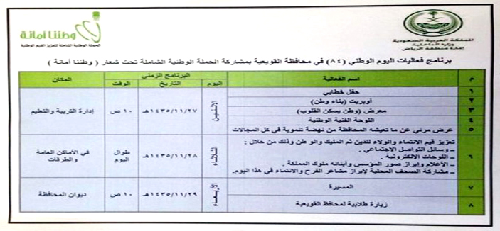 تنطلق اليوم الاثنين احتفالات محافظة القويعية باليوم الوطني المجيد الـ 84 التي تستمر فعالياتها لثلاثة أيام وذلك بمشاركة القطاعات الحكوميَّة الأمنيَّة والخدميَّة والقطاع الخاص وأهالي المحافظة وفق البرنامج الذي اعتمده محافظ القويعية بعد العديد من الاجتماعات التشاورية مع اللجان العاملة للخروج باحتفال وفعاليات تتناسب ومكانة هذا العرس الوطني الكبير حيث حرصت اللجان على تنوع الفعاليات لتشمل كل الفئات العمرية وجميع القطاعات الحكوميَّة والتعليميَّة والقطاع الخاص كما حرصت على اشراك المواطن في هذه الفعاليات الوطنيَّة هذا وارتسمت لوحة فنيَّة وطنيَّة في الشوارع الرئيسة والميادين والحدائق العامَّة باللون الأخضر حاملة راية التوحيد الخالدة وصور الرموز المؤسس جلالة الملك عبد العزيز - طيَّب الله ثراه- وصور أبنائه الملوك كما توشحت المباني الحكوميَّة والمدارس باللون الأخضر وصور الرموز الوطنيَّة وعبارات الحب والولاء للوطن ورموزه لتحكي قصة التلاحم الكبير بين الشعب وقادته وأرضه التي طهرها الله بالحرمين الشريفين وكانت مشرقًا للرسالة المحمدية التي عمت بنورها أرجاء المعمورة.