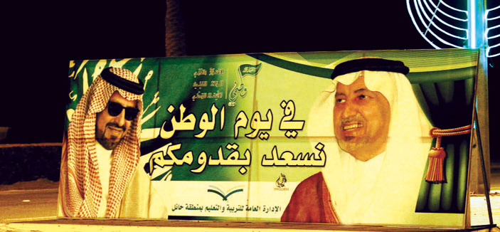 يرعى صاحب السمو الملكي الأمير خالد الفيصل بن عبدالعزيز وبحضور صاحب السمو الملكي الأمير سعود بن عبدالمحسن بن عبدالعزيز أمير منطقة حائل اليوم الأربعاء الموافق 29/11/1435هـ حفل أنشطة وفعاليات مدارس منطقة حائل احتفاءً باليوم الوطني الرابع والثمانون للملكة العربية السعودية الذي تقيمه الإدارة العامة للتربية والتعليم بمنطقة حائل بمركز الأمير سلطان الحضاري ويشتمل الحفل على كلمة لمدير عام التربية والتعليم بمنطقة حائل الدكتور يوسف بن محمد الثويني وأوبريت « أحبك يا وطن « والذي صاغ كلماته الأستاذ عبدالرحمن بن محمد الصمعان رئيس قسم النشاط الثقافي بتعليم حائل كما يدشن خلال الحفل المشاريع التعليمية المعتمدة هذا العام بالمنطقة والذي يبلغ عددها سبعة عشر مشروعاً تعليمياً للبنين والبنات بتكلفة أجمالية تقدّر بمائة وثمانية ملايين ريال ، وفيه أيضاً تكرّم الإدارة العامة للتربية والتعليم بمنطقة حائل عدد من الإدارات والقطاعات والشخصيات وشركاء النجاح في البرامج والفعاليات التي تنفذها الإدارة .