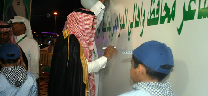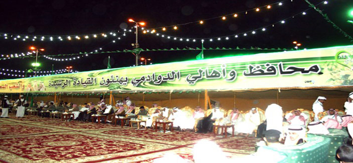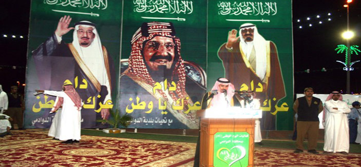 وسط كرنفال شعبي عريض مميّز شهدته حديقة الأمير سلمان بن عبدالعزيز مساء أمس الأول الثلاثاء احتفاءً بذكرى اليوم الوطني المجيد، امتزجت خلاله مشاعر الانتماء الصادق للوطن والولاء المخلص للقيادة, وحظي بقدر كبير من الاهتمام من حيث التجهيز المتكامل والتنظيم المتقن الذي كان للبلدية وإدارة التعليم النصيب الأوفرفي ذلك، وتشرّف برعاية هذا الاحتفاء المشرف العام على تنظيمه سعادة محافظ الدوادمي الأستاذ مرّان بن قويد وبحضور وكيل المحافظة الأستاذ عبدالله العشري وجمع غفير من المسؤولين المدنيين والعسكريين وأعضاء هيئات التدريس بالكليات والتعليم العام، ورجال الحسبة ورؤساء المراكز والمعرفين، ووجوه المجتمع وأعيانه ورجال المال والأعمال ورجالات الصحافة والإعلام والأهالي وعدد من الجاليات، وسط تواجد أمني ودعوي، حيث اشتملت فقراته على القرآن الكريمر رتّله الأستاذ محمد الكرشمي، ثم ألقى راعي الحفل رئيس اللجنة العليا المنظّمة محافظ الدوادمي الأستاذ مران بن قويد كلمة ضافية جاء فيها: