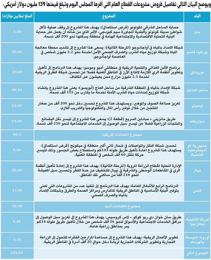 وأعلن الحربش عن اعتماد المجلس 10 منح يبلغ مجموعها 5.75 مليون دولار أمريكي لدعم المشروعات والبرامج ا لانمائية الهامة الموضحة على النحو التالي: