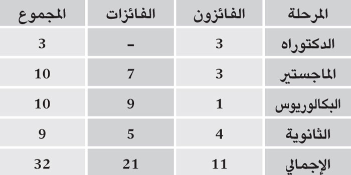 وقد فاز في مرحلة الماجستير عشرة من المتفوقين والمتفوقات، ثلاثة من المتفوقين هم: