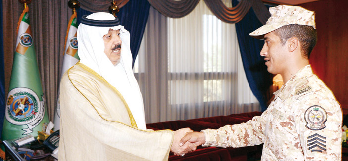 كرم صاحب السمو الملكي الامير متعب بن عبدالله بن عبدالعزيز وزير الحرس الوطني في مكتب سموه بوزارة الحرس الوطني أمس الرقيب اول فلاح غالب السبيعي أحد منسوبي وحدة الدوريات الامنية بوزارة الحرس الوطني نظير قيامه بعمل بطولي بإنقاذه عائلة سعودية حاصرتها النيران في احدى الشقق المفروشة بمدينة خميس مشيط الأسبوع الماضي. وقد أثنى سموه على تضحيته وتفانيه في إنقاذ هذه الأسرة مناشدا الجميع بأن يكونوا فاعلين في مجتمعهم وأداء رسالتهم بكل إخلاص وأمانة وفي جميع الظروف والأحوال.
