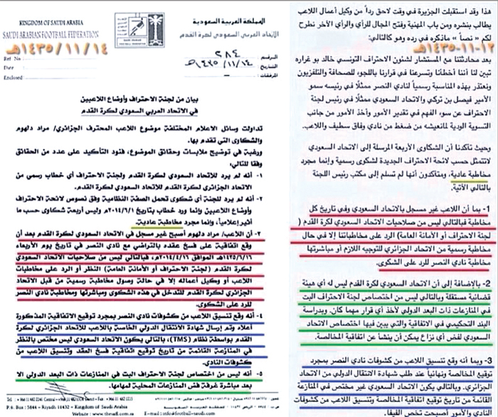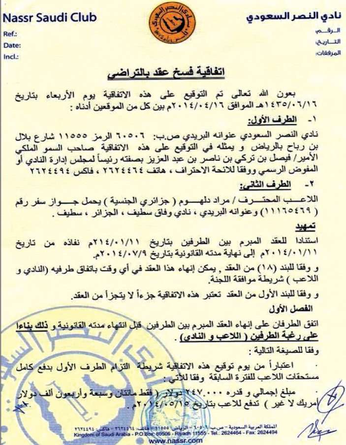 حيث أوضح رئيس النادي الأستاذ حسان حمّار أنهم تقدّموا بشكواهم ضد نادي النصر وتم إرفاق كافة الأوراق والمستندات وكذلك دفع 2000 فرنك سويسري كإنهاء لجميع المتطلبات الخاصة بانتقال لاعبهم مراد دلهوم وواعدنا الفيفا بحل الموضوع في السابع والعشرين من الشهر الحالي. مضيفاً: تلزم الاتفاقية بين الناديين جراء انتقال اللاعب مراد دلهوم على تسديد 200 ألف دولار دفعة واحدة إلا أن النصر لم يسدد إلا 100ألف دولار فقط وظل يماطل بالمبلغ المتبقي أكثر من مرة دون وفاء بالعهود مستغرباً هذا التصرف غير المقبول.