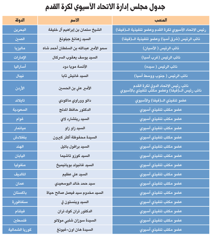 في جانب آخر تدور همسات الصراع الآسيوي على مناصب عضوية المكتب التنفيذي بالاتحاد الآسيوي لكرة القدم (14 مقعداً) تمثل التوزيع الجغرافي لاتحادات القارة الآسيوية (غرب آسيا 12 اتحاد) و(شرق آسيا 10 اتحادات) و(جنوب ووسط آسيا 13 اتحاد) و(الآسيان 12 اتحاد)، حيث من المنتظر أن تشتعل أولى الصراعات على منصب نائب الرئيس إذ يكفل الدستور الآسيوي للرئيس بأربعة نواب يمثلون جغرافية الاتحادات وستكون الأعين منصبة على منصب نائب الرئيس من الغرب الآسيوي بعد أن أعلن الإماراتي يوسف السركال نائب رئيس الاتحاد الآسيوي لكرة القدم أنه سيترجل من منصبه نهاية الدورة الانتخابية الحالية مؤكداً أن القرار نهائي ولارجعة فيه.