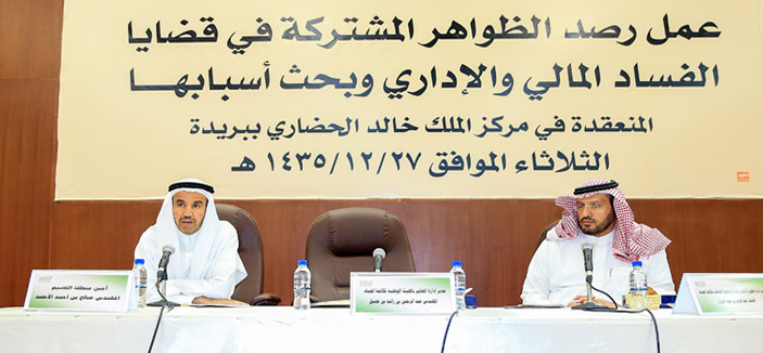 نظمت الإدارة العامة للتطوير والتخطيط الإداري بأمانة منطقة القصيم بالتعاون مع الهيئة الوطنية لمكافحة الفساد، ورشة عمل لرصد الظواهر المشتركة في قضايا الفساد المالي والإداري وبحث أسبابها، وذلك في مركز الملك خالد الحضاري ببريدة يوم أمس الأول, وافتتح أمين القصيم المهندس صالح الأحمد، اللقاء بكلمة، متطرقاً لرؤية الأمانة في هذا الجانب والتي ترى التكامل بين مراقبة السلوك ومراقبة الأداء والتركيز على مراقبة الأداء ، الذي يعد أشمل ويحمل معه النتيجة والمحصلة النهائية، واعتبر اللقاء بمثابة خطوة تعزز الشراكة بين الأمانة والهيئة الوطنية لمكافحة الفساد لتعزيز القيم.